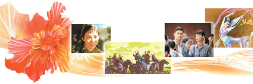 图左起依次为电影《英雄儿女》剧照、版画《乌兰牧骑之歌》、电视剧《平凡的世界》剧照、舞剧《丝路花雨》剧照。