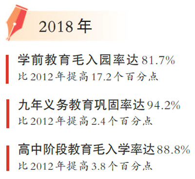 党的十八大以来,以习近平同志为核心的党中央进一步把教育摆在优先发展的战略地位,在“幼有所育、学有所教”上取得新进展。2018年,基础教育经费总投入29251亿元,比2012年增加了74.1%。全国学前教育毛入园率、九年义务教育巩固率和高中阶段教育毛入学率分别比2012年提高了17.2、2.4和3.8个百分点。