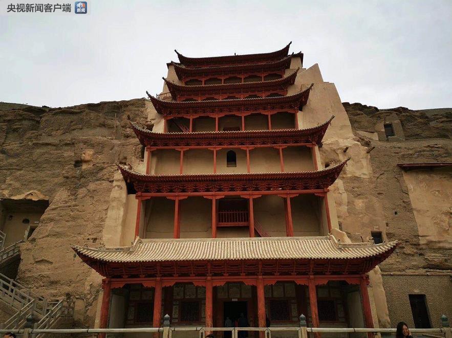 △图中的九层楼阁,是莫高窟的标志性建筑,为保护窟内石胎泥塑的佛像而建。(央视记者张晓鹏拍摄)
