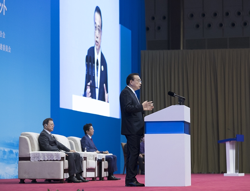 李克强指出,三方要共同努力提升区域经济一体化水平。中日韩是区域全面经济伙伴关系协定(RCEP)谈判的坚定支持者,应当落实上个月“曼谷共识”,一鼓作气,乘势而上,确保明年正式签署协议。三方应推动中日韩自贸区谈判尽快取得实质性进展,坚定维护多边主义和自由贸易。要共同努力打造现代服务业新的增长点。中国有不断升级的超大规模市场,在养老、健康、育幼等领域需要增加服务供给。中国正推进金融领域开放,提前取消证券、期货、基金、寿险外资股比限制。这既有利于三国应对老龄化、卫生健康、金融稳定等领域的共同挑战,也有助于更好实现共同发展。