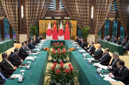 李克强表示,当前中日关系总体保持改善发展势头,这一局面来之不易。中方重视中日关系,习近平主席在北京会见了你。双方应恪守中日四个政治文件确立的各项原则,继续本着以史为鉴、面向未来的精神,立足当前,着眼长远,妥善处理敏感问题,推动两国关系在重回正轨的基础上不断实现新的发展。去年我访问日本期间,首相先生陪同我访问了北海道。我今天在成都都江堰同你会谈,也是尽地主之谊。希望日方同中方相向而行,为双方开展更多高层交往营造良好条件和氛围。