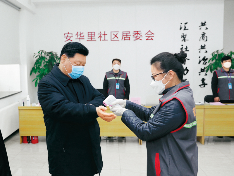2020年2月10日,中共中央总书记、国家主席、中央军委主席习近平在北京调研指导新冠肺炎疫情防控工作。这是习近平在朝阳区安贞街道安华里社区,了解基层一线疫情联防联控情况。 新华社记者 庞兴雷/摄