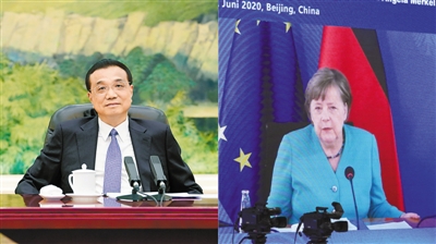 6月11日,国务院总理李克强在北京人民大会堂同德国总理默克尔举行视频会晤(拼版照片)。新华社记者 刘卫兵摄