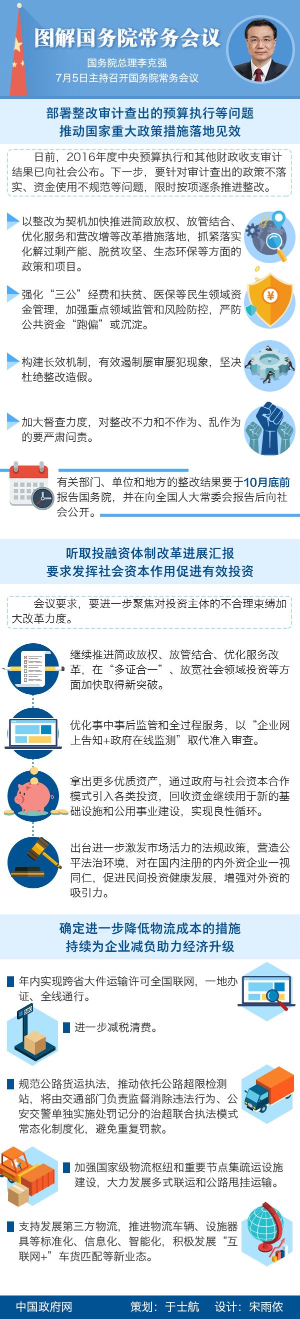 国务院总理李克强7月5日主持召开国务院常务会议,部署整改审计查出的预算执行等问题,推动国家重大政策措施落地见效;听取投融资体制改革进展汇报,要求发挥社会资本作用促进有效投资;确定进一步降低物流成本的措施,持续为企业减负助力经济升级。
