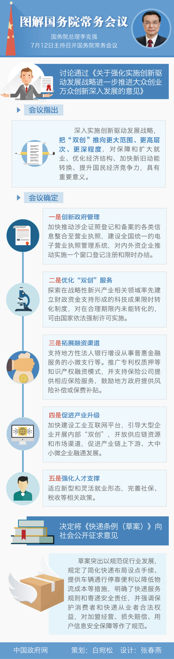 国务院总理李克强7月12日主持召开国务院常务会议,讨论通过《关于强化实施创新驱动发展战略进一步推进大众创业万众创新深入发展的意见》,决定将《快递条例(草案)》向社会公开征求意见。