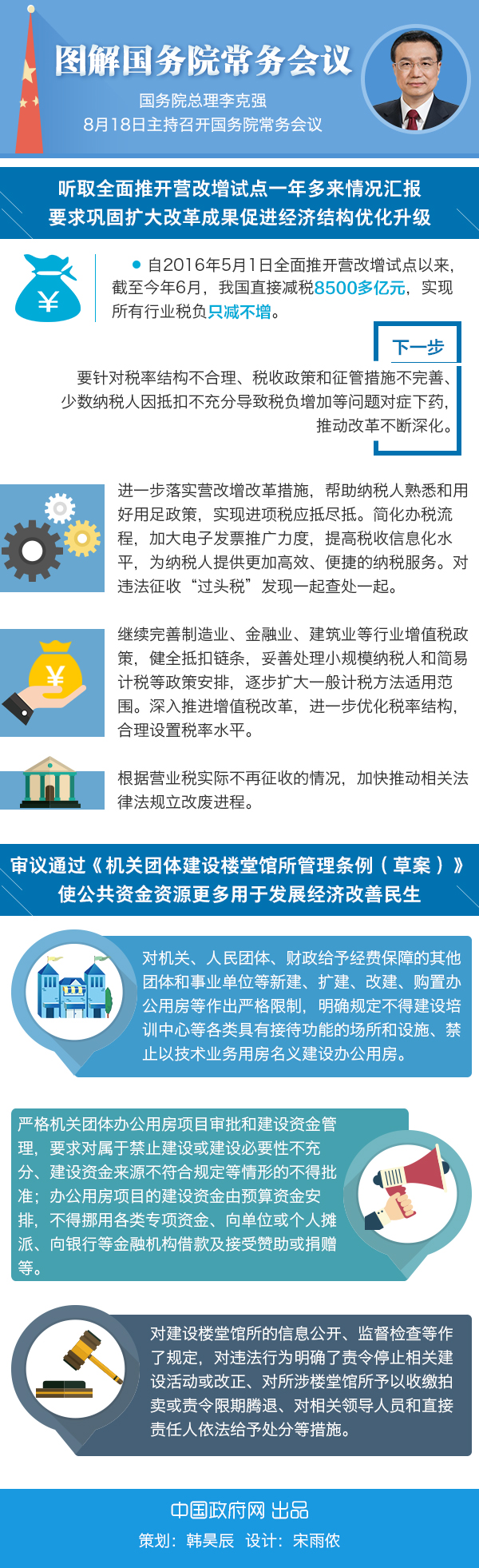 国务院总理李克强8月18日主持召开国务院常务会议,听取全面推开营改增试点一年多来情况汇报,要求巩固扩大改革成果促进经济结构优化升级;审议通过《机关团体建设楼堂馆所管理条例(草案)》,使公共资金资源更多用于发展经济改善民生。