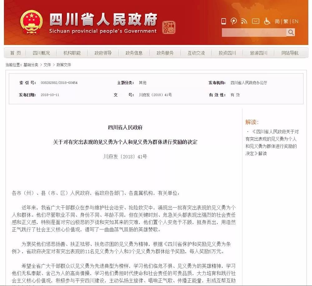 10月20日  《四川日报》报道,10月11日,省政府印发《关于对有突出表现的见义勇为个人和见义勇为群体进行奖励的决定》,对有突出表现的郭仕华等11名见义勇为个人和3个见义勇为群体给予奖励,每人奖励5万元。