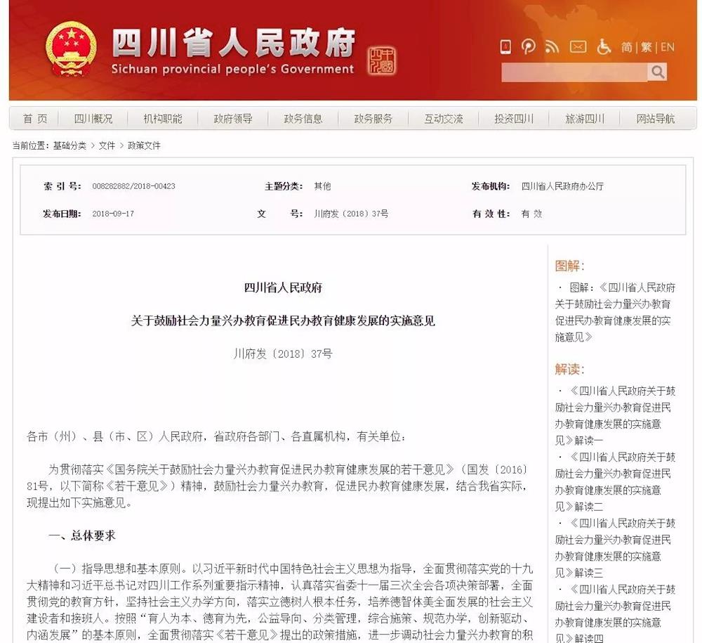 10月16日  《四川日报》报道,9月17日,省政府出台《关于鼓励社会力量兴办教育促进民办教育健康发展的实施意见》,进一步调动社会力量兴办教育的积极性,促进民办教育持续健康发展。《意见》提出,要积极鼓励和大力支持社会力量举办非营利性民办学校。放宽办学准入条件,扩大办学准入范围。