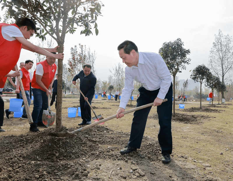 3月18日上午,四川省和成都市党政军领导来到位于成都市成华区北湖生态公园植树点,参加2022年义务植树活动(图片来源:四川省人民政府网)
