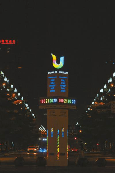 成都大运会迎来倒计时100天。3月17日晚,天府广场的大运会倒计时装置将天数的计时数字调整为100( 四川日报全媒体记者 杨树 摄,图片来源:四川日报)