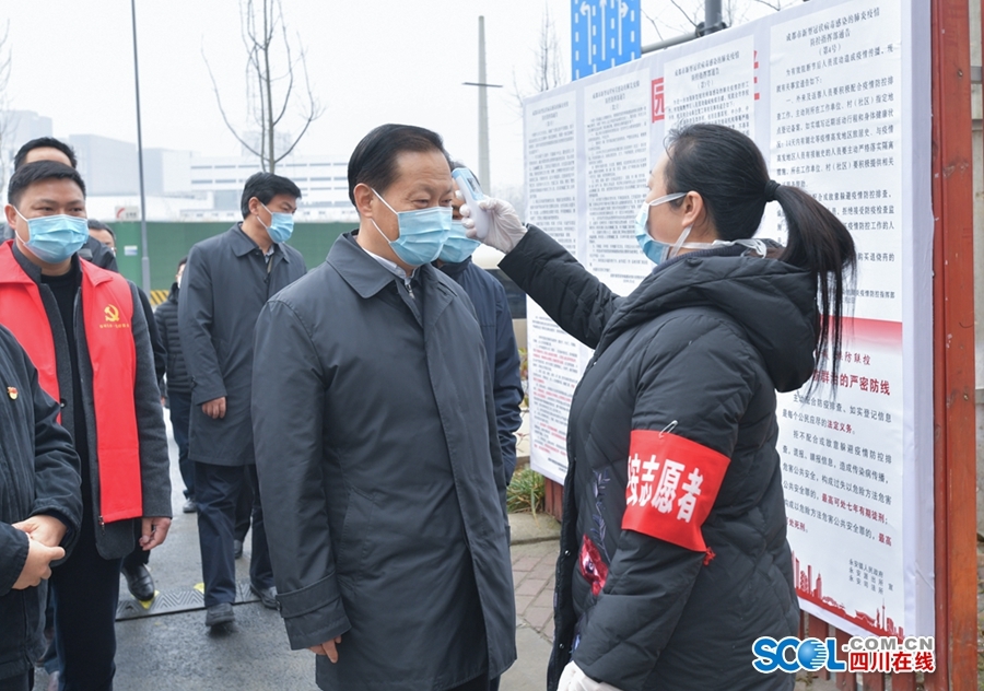 2月12日,彭清华书记到双流区永安镇凤凰家园小区调研社区疫情防控工作,在小区门口检测体温后进入小区。