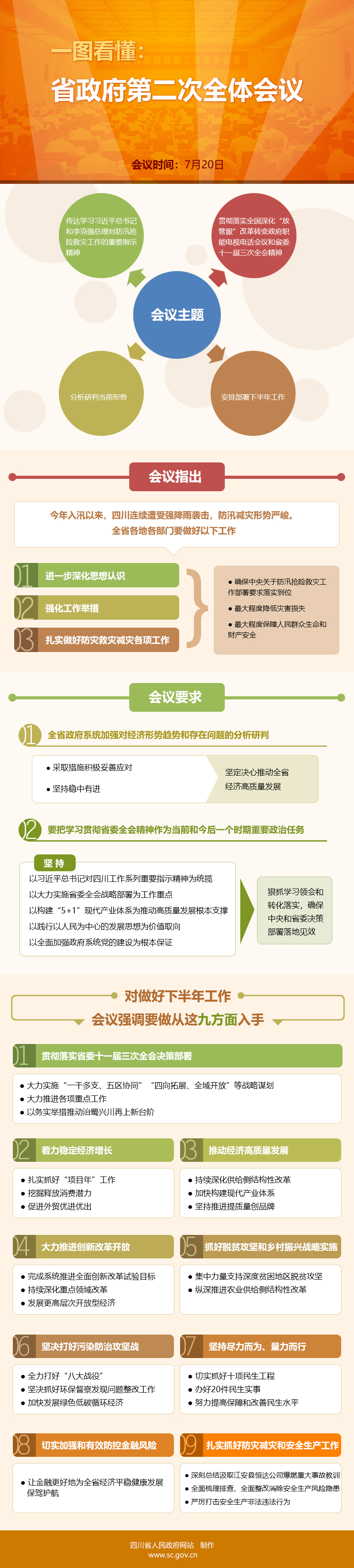 会议总结了上半年政府工作,要求全省政府系统加强对经济形势趋势和存在问题的分析研判,采取措施积极妥善应对,坚持稳中有进,坚定决心推动全省经济高质量发展。要把学习贯彻省委全会精神作为当前和今后一个时期重要政治任务,坚持以习近平总书记对四川工作系列重要指示精神为统揽,以大力实施省委全会战略部署为工作重点,以构建“5+ 1”现代产业体系为推动高质量发展根本支撑,以践行以人民为中心的发展思想为价值取向,以全面加强政府系统党的建设为根本保证,狠抓学习领会和转化落实,确保中央和省委决策部署落地见效。