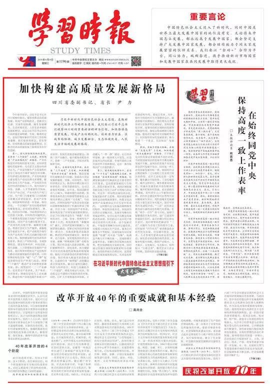 8月8日,《学习时报》头版头条“在习近平新时代中国特色社会主义思想指引下”栏目刊载四川省委副书记、省长尹力的署名文章《加快构建高质量发展新格局》,现全文转载如下: