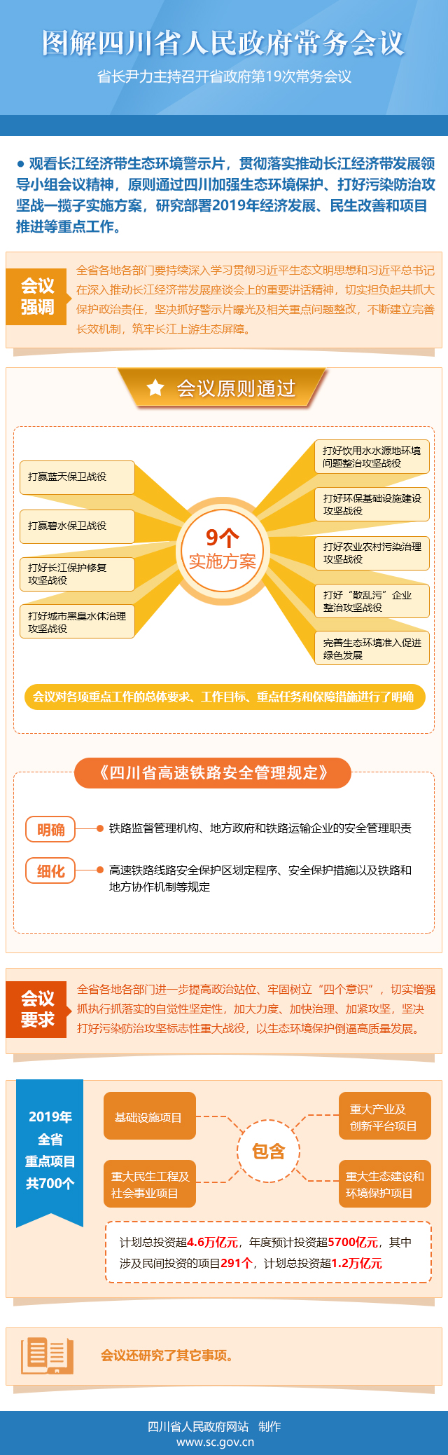 会议原则通过四川省打赢蓝天保卫战役、打赢碧水保卫战役、打好长江保护修复攻坚战役、打好城市黑臭水体治理攻坚战役、打好饮用水水源地环境问题整治攻坚战役、打好环保基础设施建设攻坚战役、打好农业农村污染治理攻坚战役、打好“散乱污”企业整治攻坚战役和完善生态环境准入促进绿色发展等9个实施方案,对各项重点工作的总体要求、工作目标、重点任务和保障措施进行了明确。