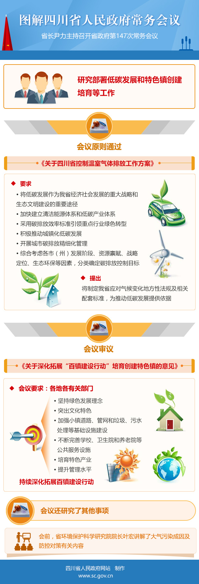 会议原则通过《关于四川省控制温室气体排放工作方案》,要求将低碳发展作为我省经济社会发展的重大战略和生态文明建设的重要途径,加快建立清洁能源体系和低碳产业体系,采用碳排放效率标准引领重点行业绿色转型,同时积极推动城镇化低碳发展,开展城市碳排放精细化管理,综合考虑各市(州)发展阶段、资源禀赋、战略定位、生态环保等因素,分类确定碳排放控制目标。《方案》提出,将制定我省应对气候变化地方性法规及相关配套标准,为推动低碳发展提供依据。