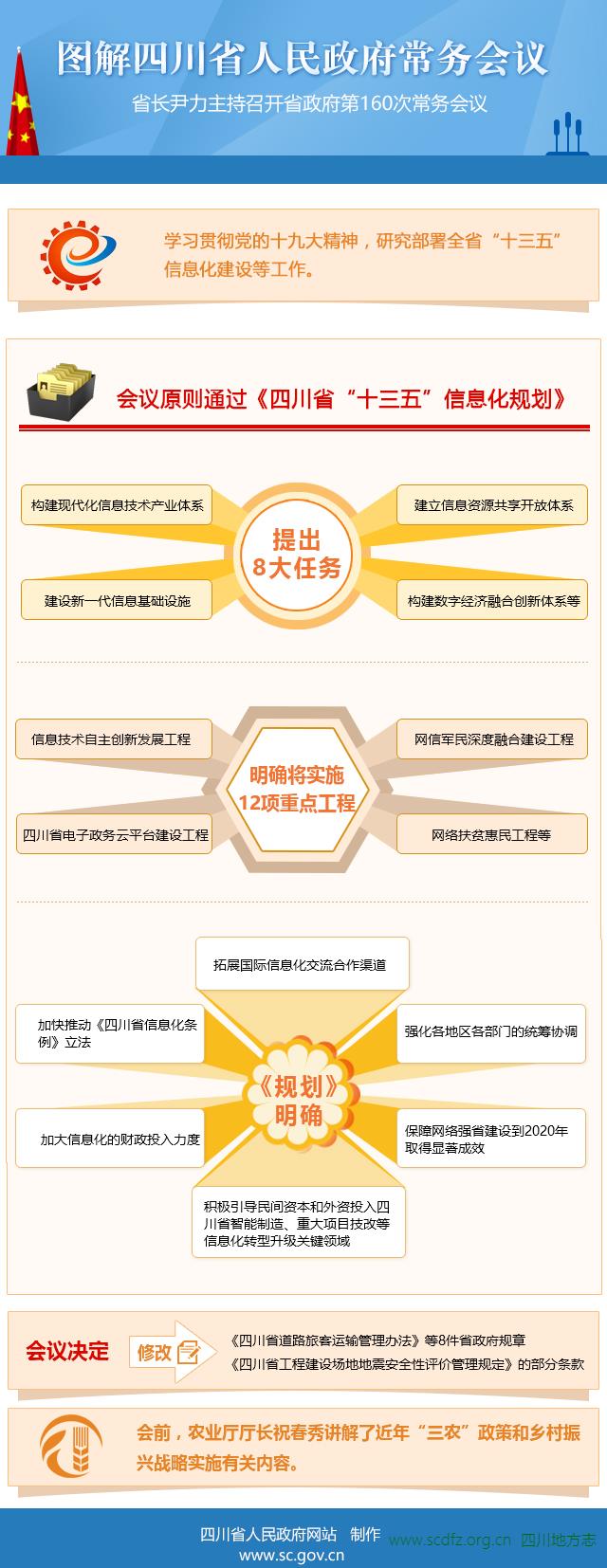 会议原则通过《四川省“十三五”信息化规划》,提出构建现代化信息技术产业体系、建设新一代信息基础设施、建立信息资源共享开放体系、构建数字经济融合创新体系等8大任务,明确将实施信息技术自主创新发展工程、四川省电子政务云平台建设工程、网信军民深度融合建设工程、网络扶贫惠民工程等12项重点工程。《规划》明确,将加快推动《四川省信息化条例》立法,加大信息化的财政投入力度,积极引导民间资本和外资投入四川省智能制造、重大项目技改等信息化转型升级关键领域,拓展国际信息化交流合作渠道,强化各地区各部门的统筹协调,保障网络强省建设到2020年取得显著成效。