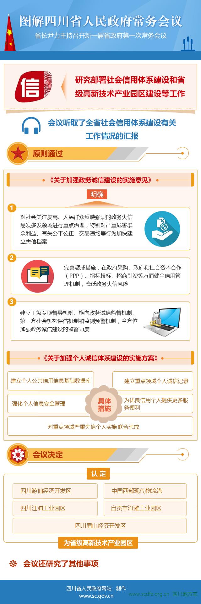 会议听取了全省社会信用体系建设有关工作情况的汇报,原则通过《关于加强政务诚信建设的实施意见》,明确对社会关注度高、人民群众反映强烈的政务失信易发多发领域进行重点治理,特别对严重危害群众利益、有失公平公正、交易违约等行为加快建立失信档案,完善惩戒措施,在政府采购、政府和社会资本合作(PPP)、招标投标、招商引资等方面健全信用管理机制,降低政务失信风险,同时建立上级专项督导机制、横向政务诚信监督机制、第三方社会机构评估机制和监测预警机制,全方位加强政务诚信建设的监督力度;原则通过《关于加强个人诚信体系建设的实施方案》,提出建立个人公共信用信息基础数据库、建立重点领域个人诚信记录、强化个人信息安全管理、为优良信用个人提供更多服务便利、对重点领域严重失信个人实施联合惩戒等具体措施。