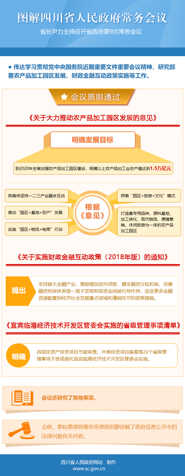2018年7月25日,省委副书记、省长尹力主持召开省政府第9次常务会议,传达学习贯彻党中央国务院近期重要文件重要会议精神,研究部署农产品加工园区发展、财政金融互动政策实施等工作。