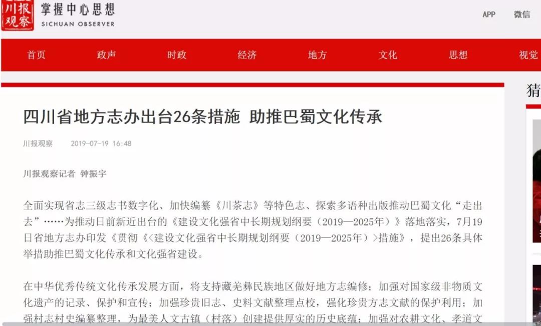 2019.7.19日四川在线报道:四川省地方志办出台26条措施传承巴蜀文化