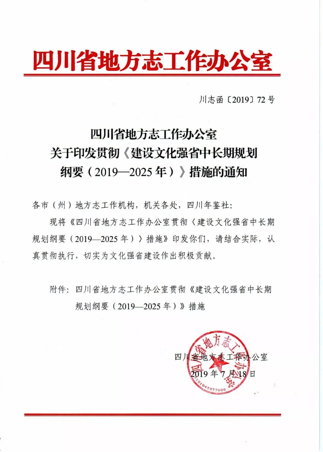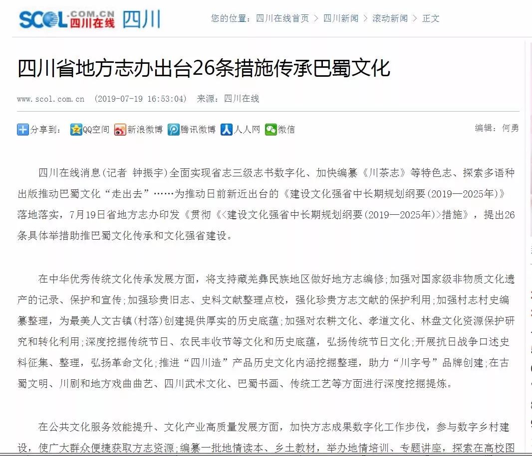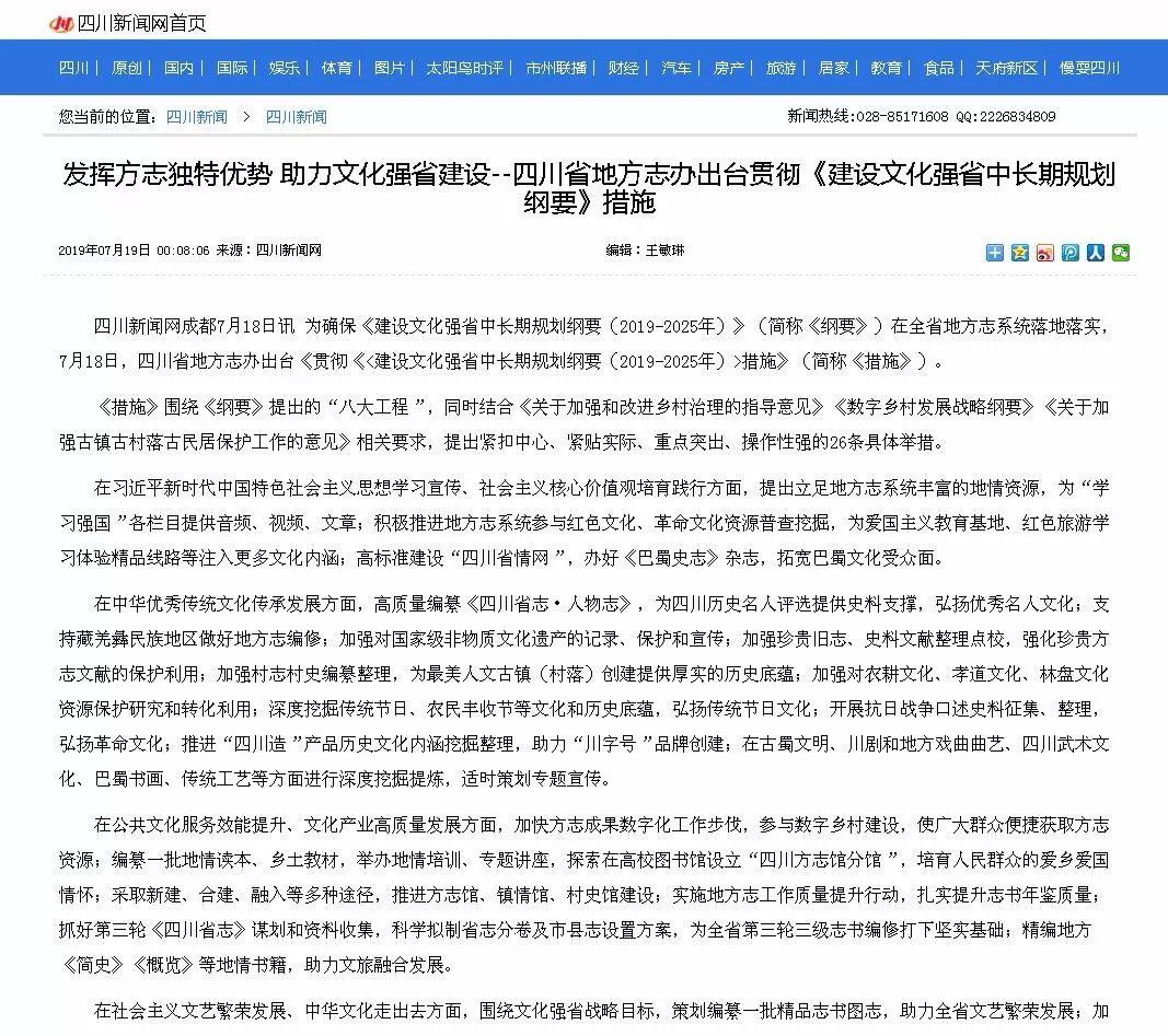 2019.7.18日中新网报道:四川省地方志办出台贯彻《建设文化强省中长期规划纲要》措施