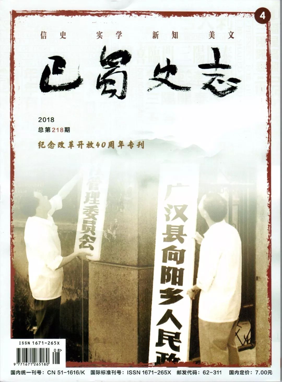 《巴蜀史志》2018年第4期“纪念改革开放40周年专刊”全新改版并启用中国书法家协会副主席、四川省书法家协会原主席何应辉题写的新刊名