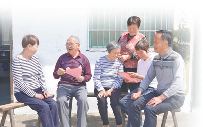 倪伯苍(左二)和陈玉兰(左三)在向村民发放法规宣传单。 |