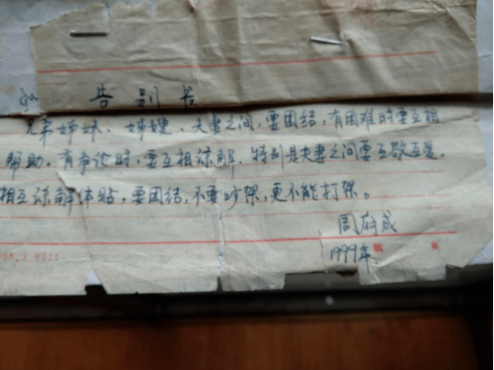父亲在1999年就写好了告别书交给我保存,其主要内容是希望兄弟姐妹、夫妻之间要团结,有困难时要互相帮助,有争论时要互相谅解,特别是夫妻之间要互敬互爱,相互谅解体贴,要团结,不要吵架,更不能打架。其要义就是家庭成员要和谐相处,不互相指责,这是父亲一辈子处理家庭成员和社会成员关系的真谛,这是好家风的真传。