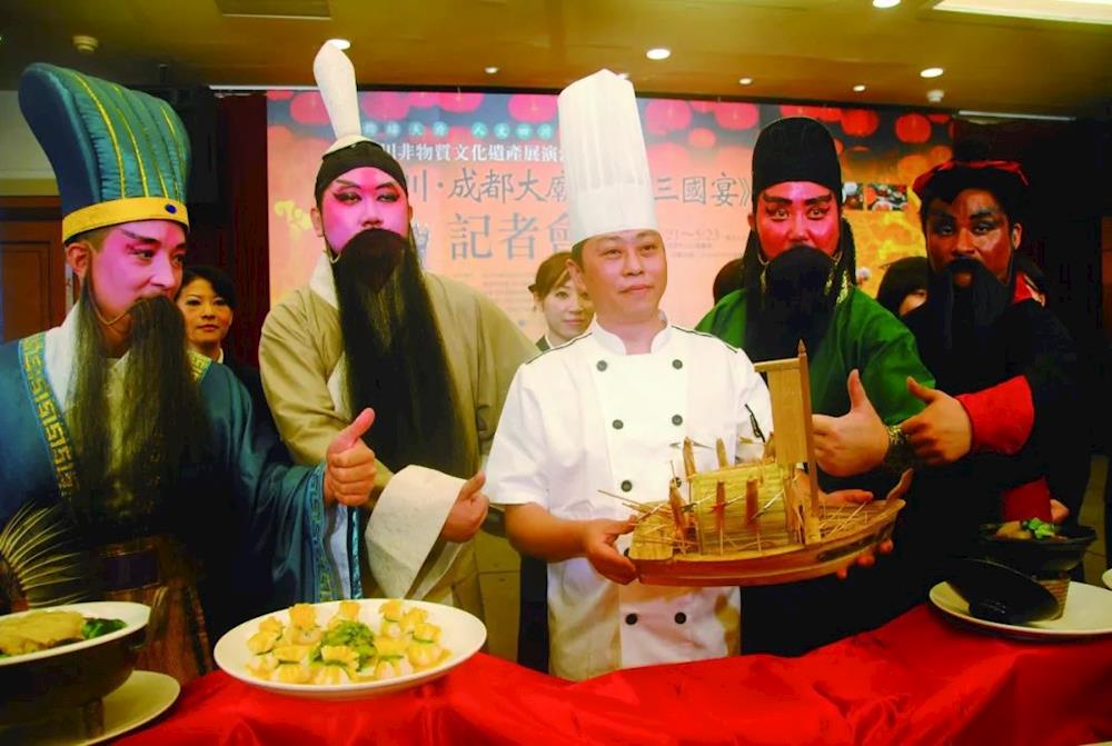 2010年5月21-23日,“四川·成都大庙会”在中国台湾地区台北中山纪念馆中山公园广场举办,这是四川首次在台湾举办大型户外文化交流活动。图为四川厨师在记者会上展示“三国宴”中的名菜“草船借箭”(新华社 供图)