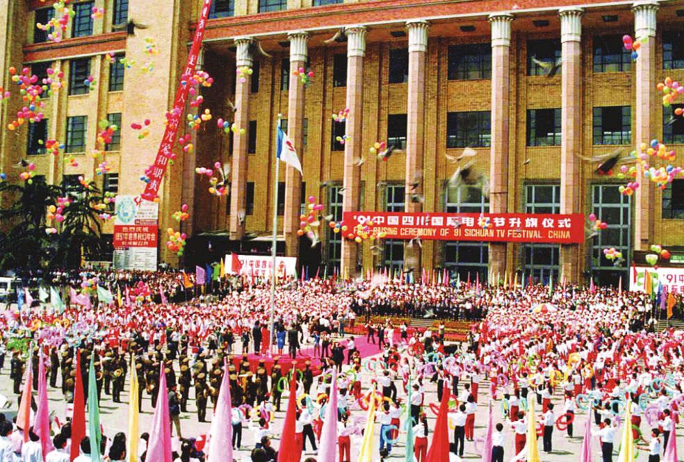 1991年,首届四川国际电视节在成都举行。图为电视节升旗仪式(图片来源:《辉煌60年》)