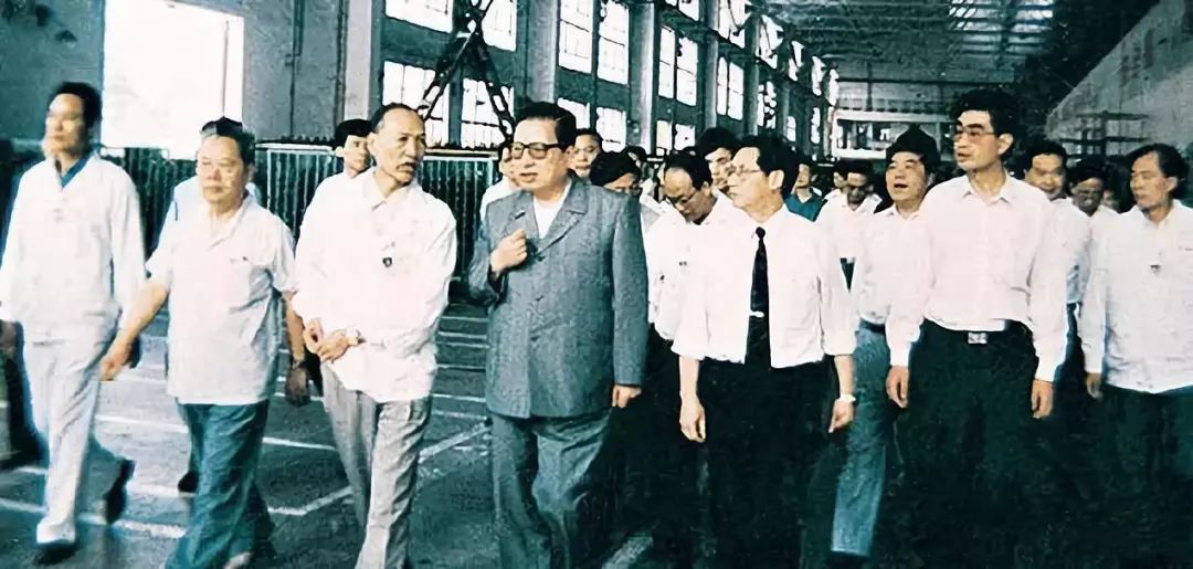 1993年6月,时任全国人大委员长乔石(前排左四)在重庆视察嘉陵集团(图片来源:中国网)