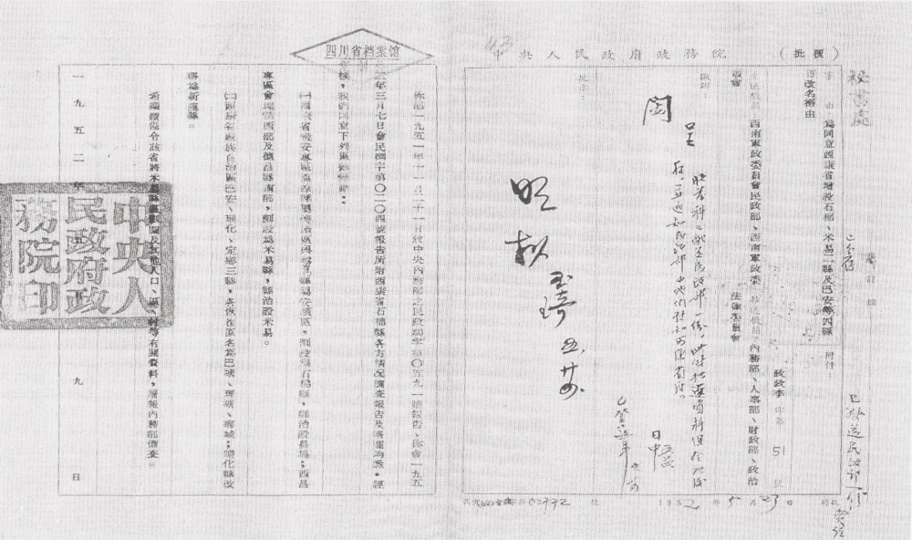1951年12月28日,西康省人民政府具文呈报中央人民政府政务院并西南军政委员会。1952年3月9日,中央人民政府西南军政委员会“民(52)字第0204号函”复西康省人民政府,“石绵县的‘绵字’应以‘棉’字为正”。