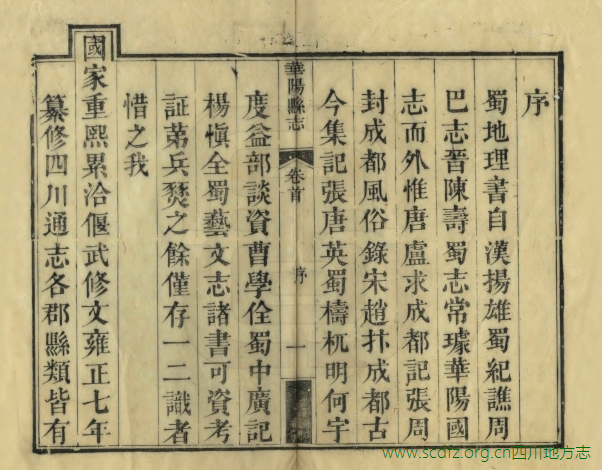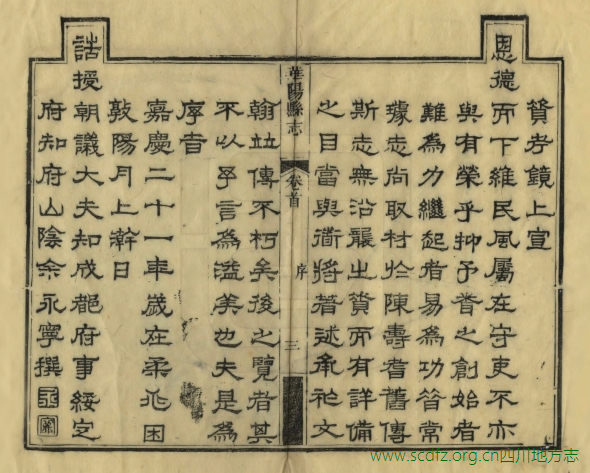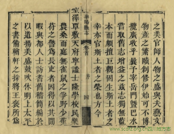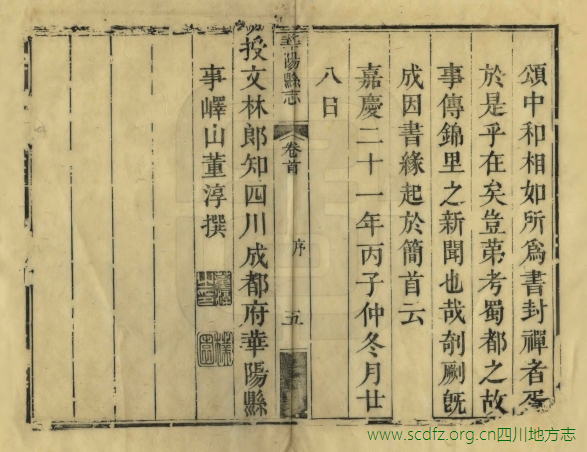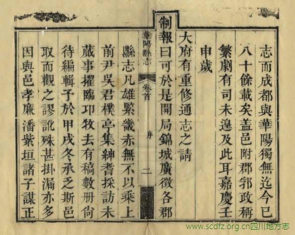 华阳县在今成都东南部。成都、华阳两县,旧皆为成都府治地,一处西北,一处东南,无明显之疆界。且各级衙署、学校、书院相互交错,如华阳县衙便设在成都县境内,成都府学则又设在华阳县境内等等。康熙九年(1670),废华阳县,将其并入成都县。至雍正五年(1727)恢复县治。与成都县相似,华阳县前也无志书可寻。嘉庆十七年(1812),因准备编纂《嘉庆一统志》和修省志,檄征各县志乘,知县吴巩延聘县中绅耆,设局纂修。历时三年后,书犹未成,吴巩此时已升任邛州直隶州知州,留下稿本数册在县署。董淳继任,翻阅底稿,认为不可使之不竟其功,遂延聘潘时彤总领此事,召集县中人士订旧稿,采新章,正讹补缺,次第编纂,历时年余,纂辑成书,于嘉庆二十一年(1816)刊刻印行。后至光绪十八年(1892),县衙拟议续修《华阳县志》,于是在原刻的基础上,增补部分条目之缺漏后重刊,而续志最终没有完成。