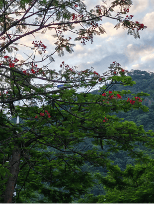 在朗朗晴空和阵阵山风之下,一排排凤凰树心领神会地扮演起了主人角色,争先恐后地向我们招手致意。它们又像军容严整、蓬勃朝气的仪仗队员,站着笔直的身板,列队迎接我们到来,并引导我们继续走向高处。