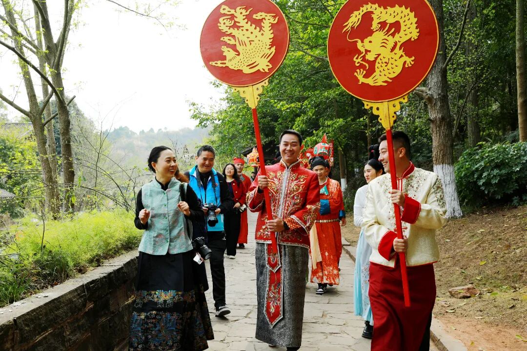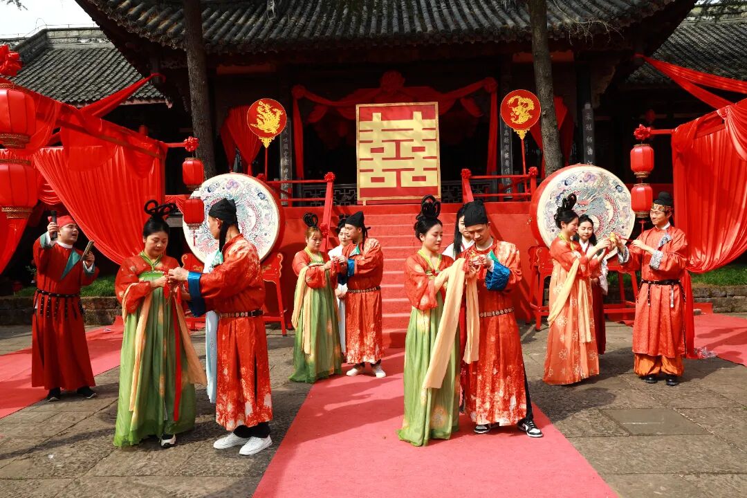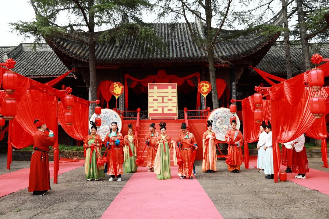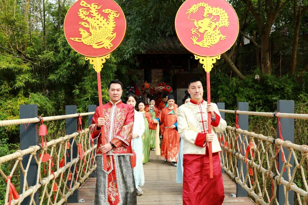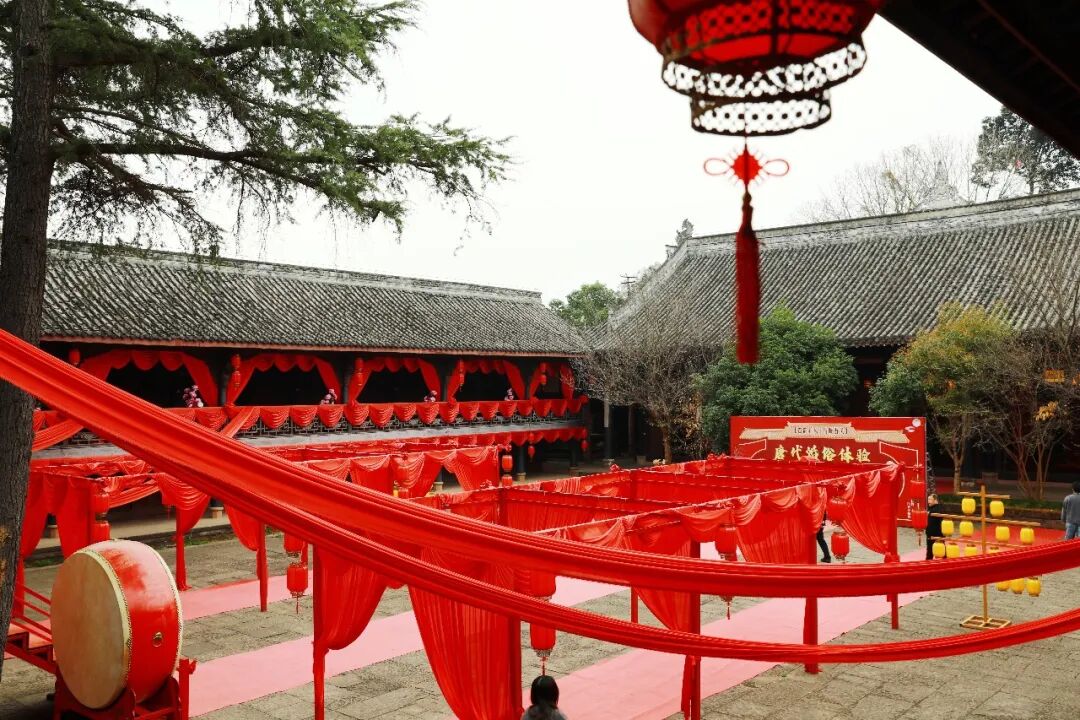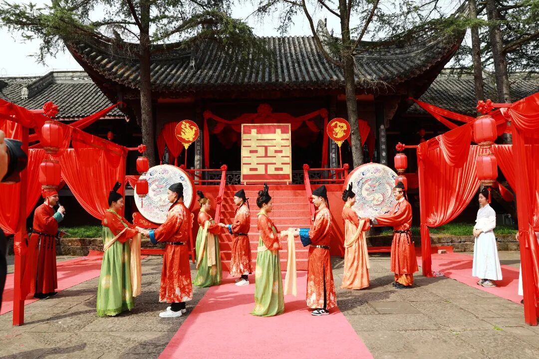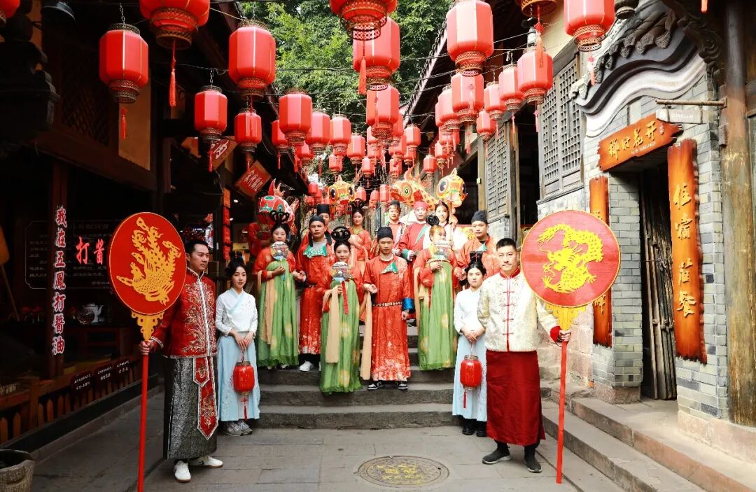 丙午年农历正月十五,元宵佳节。金堂县五凤古镇在晨光中苏醒,青石板路还带着昨夜春雨的湿润,南华宫前的红灯笼已高高挂起。今天,一场跨越千年的唐代婚俗礼仪在这里上演。