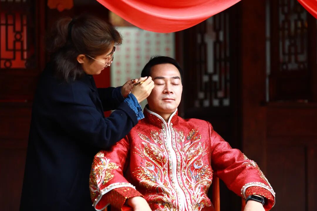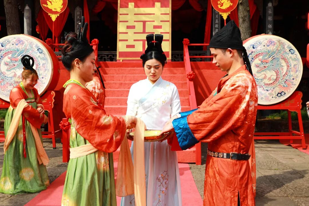 “吉时已到——启礼!”司仪一声悠长的唱赞,穿越时空,将现场拉回千年前的盛唐。四对新人身着绛红公服与青绿翟衣,在四名手持团扇的侍女的簇拥下,缓缓穿过南华宫的婚礼舞台。新娘眉心贴着金色花钿,长长的披帛随风轻扬;新郎腰系革带,足蹬崭新皮鞋,眉眼间难掩激动。