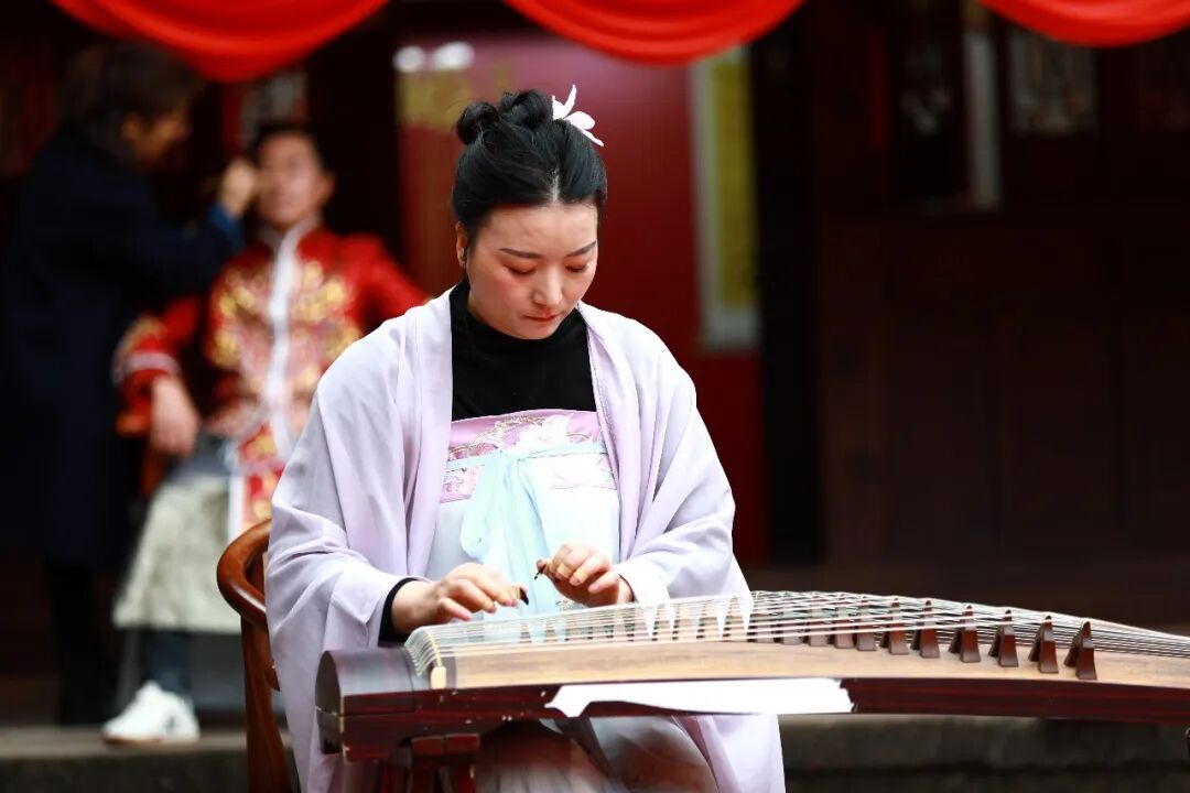 上午十时,南华宫古戏台前已聚满慕名而来的市民和游客。伴随着古筝合奏的《破阵乐》旋律,成都金堂五凤溪“古韵新 情暖五凤”唐代婚俗集体婚礼”正式拉开帷幕。