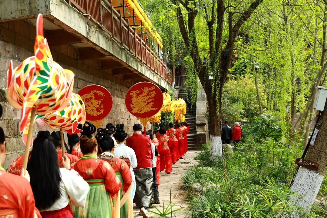 礼成后,四对新人手牵红绸,走出南宫来到移民广场,五凤镇女子舞龙队和游客用庄重的礼仪为新人们祝福、欢呼。来自赵镇的陈姓新郎难掩心头的喜悦:“婚礼虽然简化了唐代流程,但每一个环节都有寓意。今天是我们人生的大日子,也是元宵节,能在这么多人的见证下完成婚礼,一辈子都忘不了。”