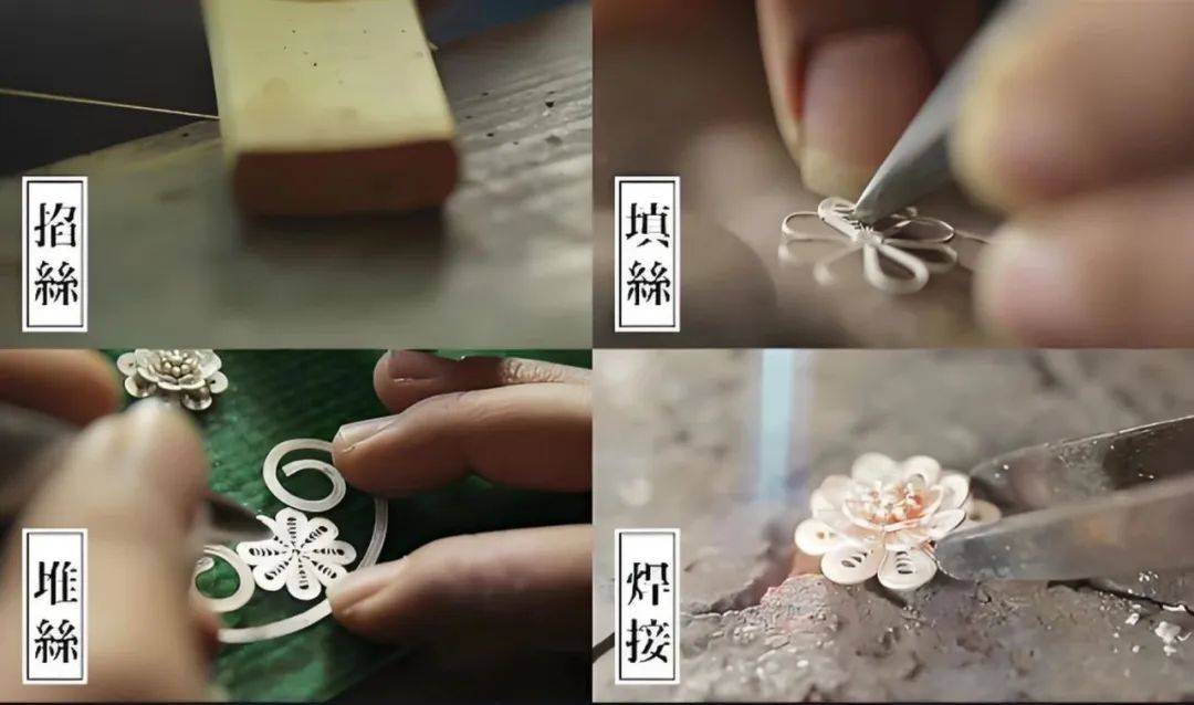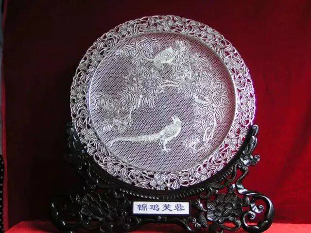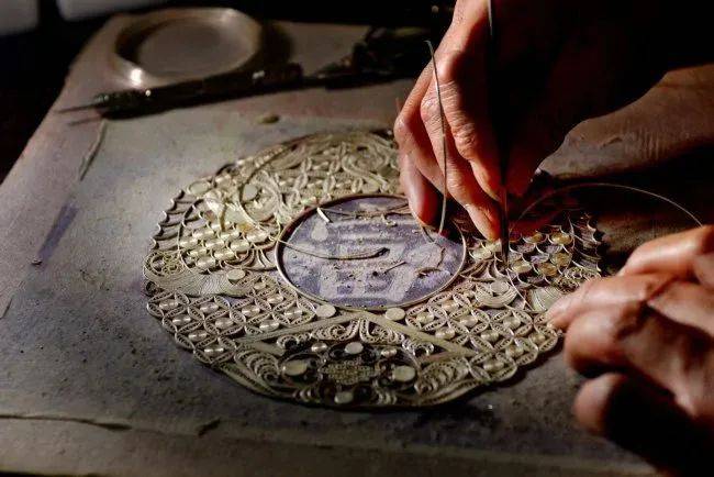 成都银花丝制作技艺以白银为材料,综合运用花丝和錾刻、填丝、垒丝、穿丝、搓丝、焊接等技艺,按照设计要求精心制作出各种手工艺品,其成品具有较高的艺术和收藏价值。其制作工艺复杂精细,从设计、配丝、编制边框、图纹填充、焊接到成品,需要经过手工无胎成型、堆累、穿纽、打磨、抛光、镶嵌、洗色、防氧化处理等十几种技法,至少需要30道工序,需要剪刀、摄子、踏刀、钉锤、规尺、格丝板、小焊枪等各类工具。