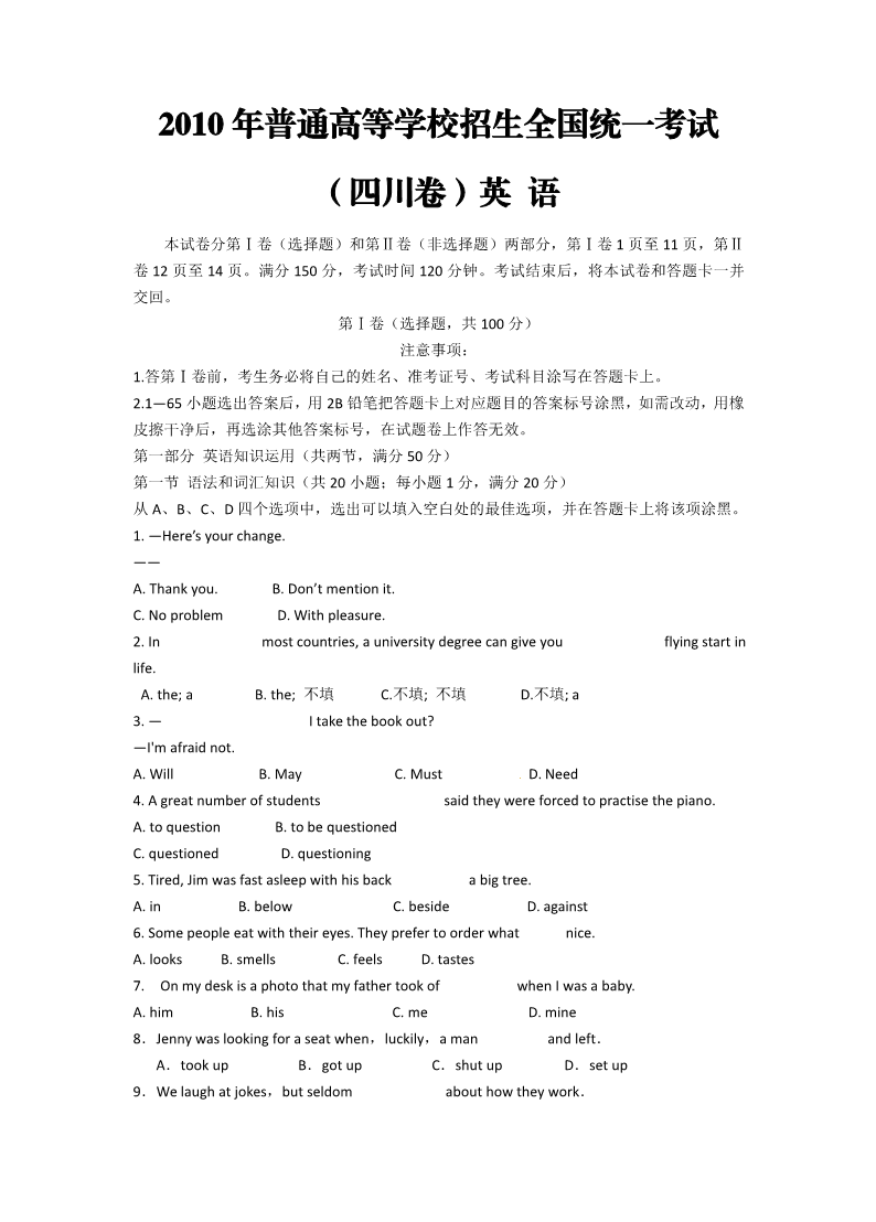 2010年四川省高考 英语试卷(含答案)