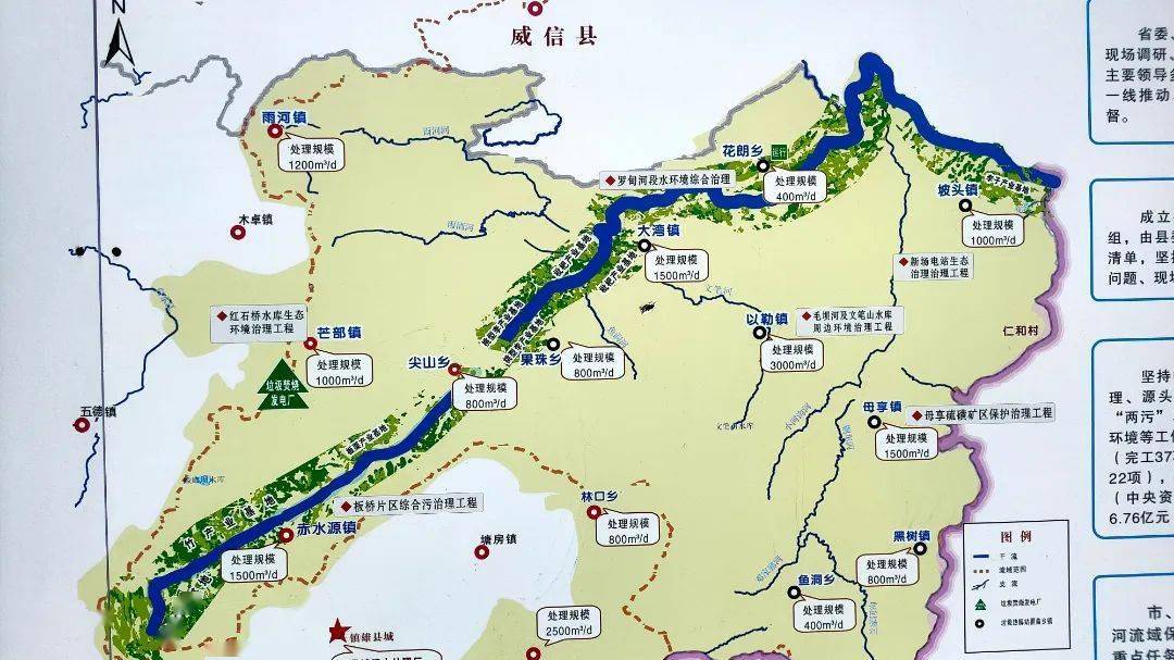 银厂村党群活动中心生态环境宣传栏上,赤水河流域镇雄段示意图显示:三股清澈的溪水从赤水源镇银厂村彪水岩山涧涌出,在山脚处汇聚成赤水河,一路潺湲向东。
