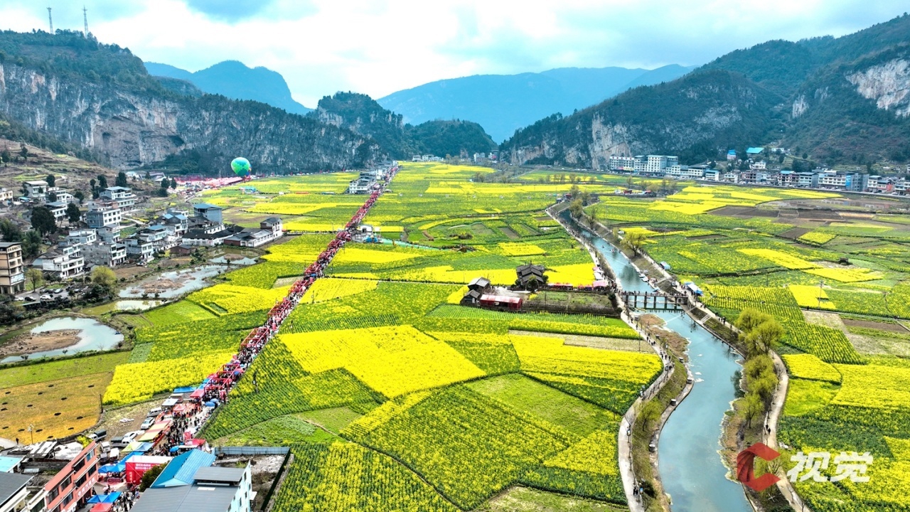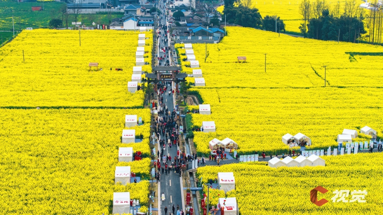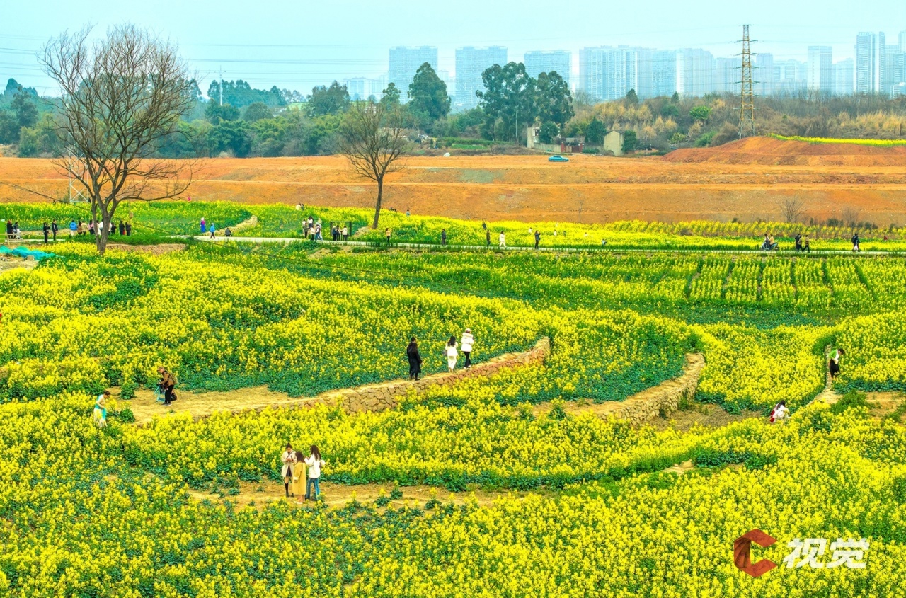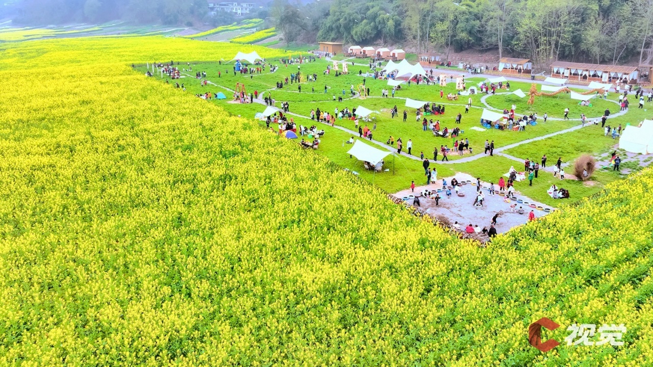 走进广安市广安区花桥镇万亩油菜园区,相继绽放的油菜花与民居、山峦、河流等相映成景,构成一幅幅生机盎然的春日画卷。市民游客在花田间漫步游玩,体验“乡村赶集”。