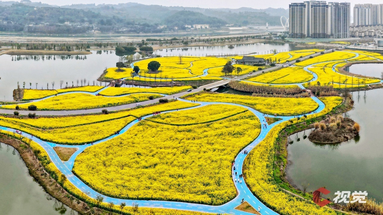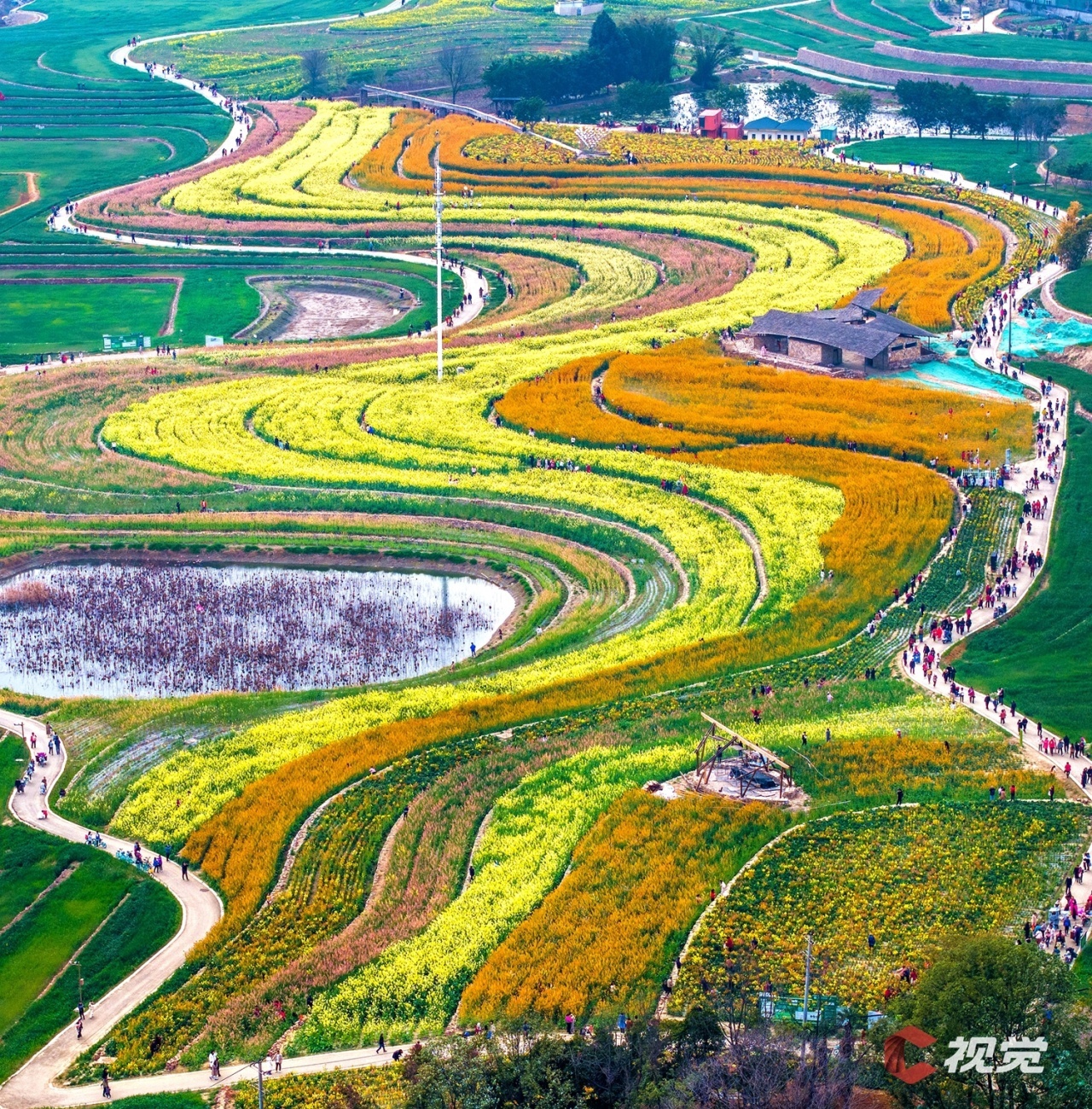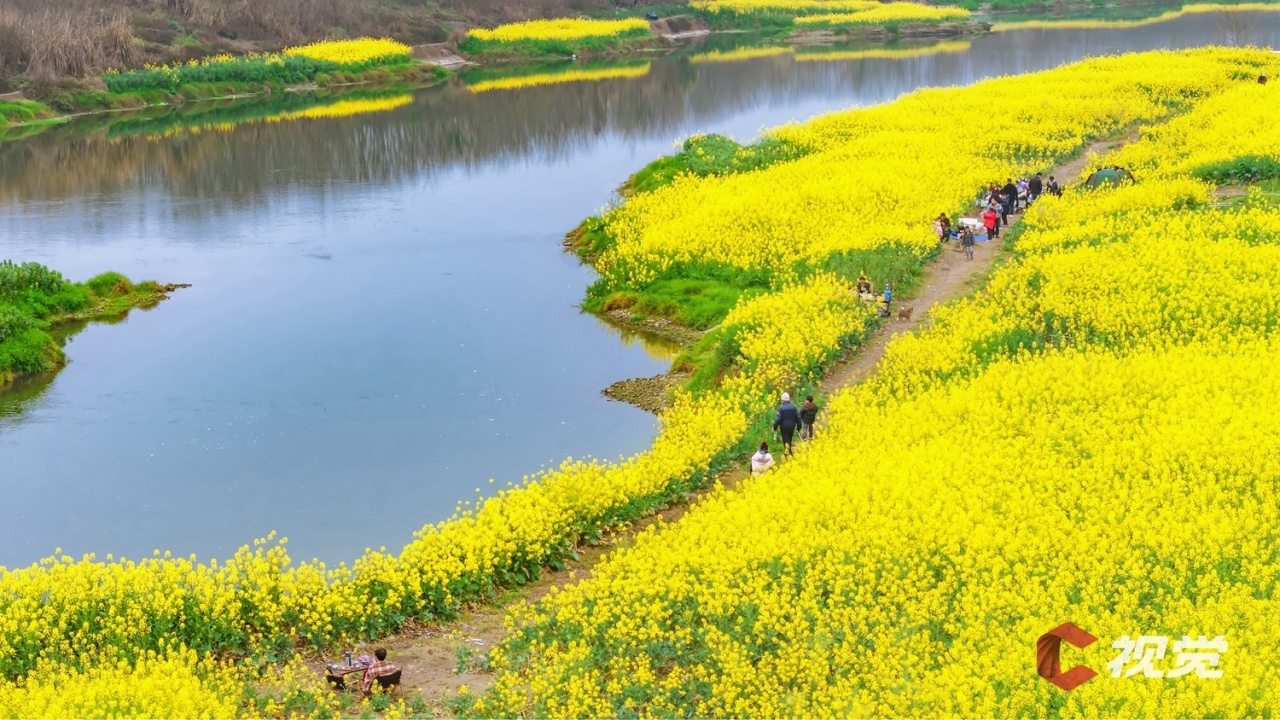 走进广安市广安区花桥镇万亩油菜园区,相继绽放的油菜花与民居、山峦、河流等相映成景,构成一幅幅生机盎然的春日画卷。市民游客在花田间漫步游玩,体验“乡村赶集”。