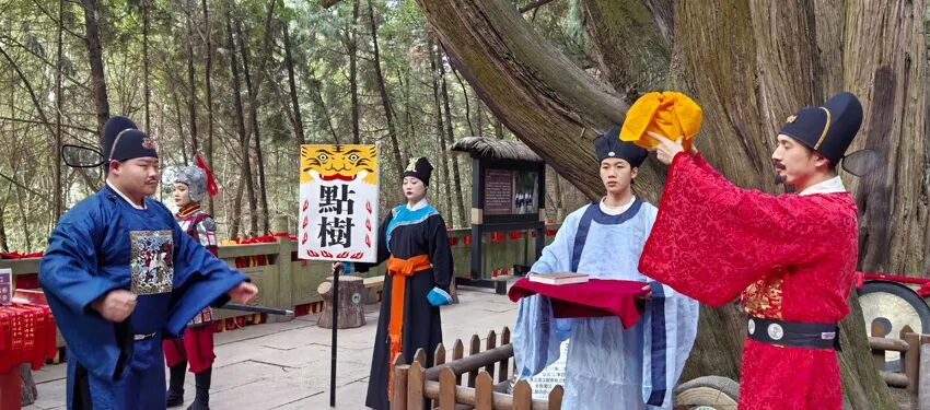 绿色长廊上,一阵锣鼓声引起了游客的注意——身着明代官服的“离任知州”与“接任官员”,穿行于古柏林间,清点交接“官树”,再现“点树交印”的古道盛典。