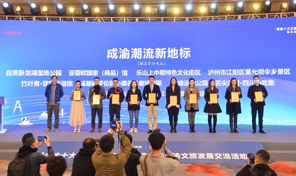 同时揭晓的还包括四个子榜单、“成渝十大文旅领军人物”、“成渝十大文旅产业地标”、“成渝潮流新地标”、“巴蜀文化旅游走廊新地标”。据主办方介绍,子榜单涵盖文化、产业、人物、潮流四个领域,人文与自然并重的黄龙溪古镇、有着“小重庆”之称的磁器口、以冰川著称于世的贡嘎山海螺沟等一批具有文旅融合、创新引领的地标获得殊荣;以四川省旅投集团董事长任丁等10位川渝文旅大咖摘走“成渝十大文旅领军人物”桂冠。