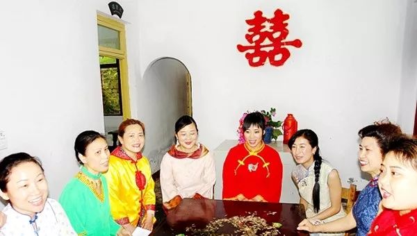 “十大碗”刚一散席,只见三四张八仙桌往堂屋正中并排放开,两边都放开长条木凳,供大家围坐。这时,出嫁女由村中两个年龄较长的姑娘伴随着坐在八仙桌的最上方,这就意味着:“坐歌堂”节目就要开场。