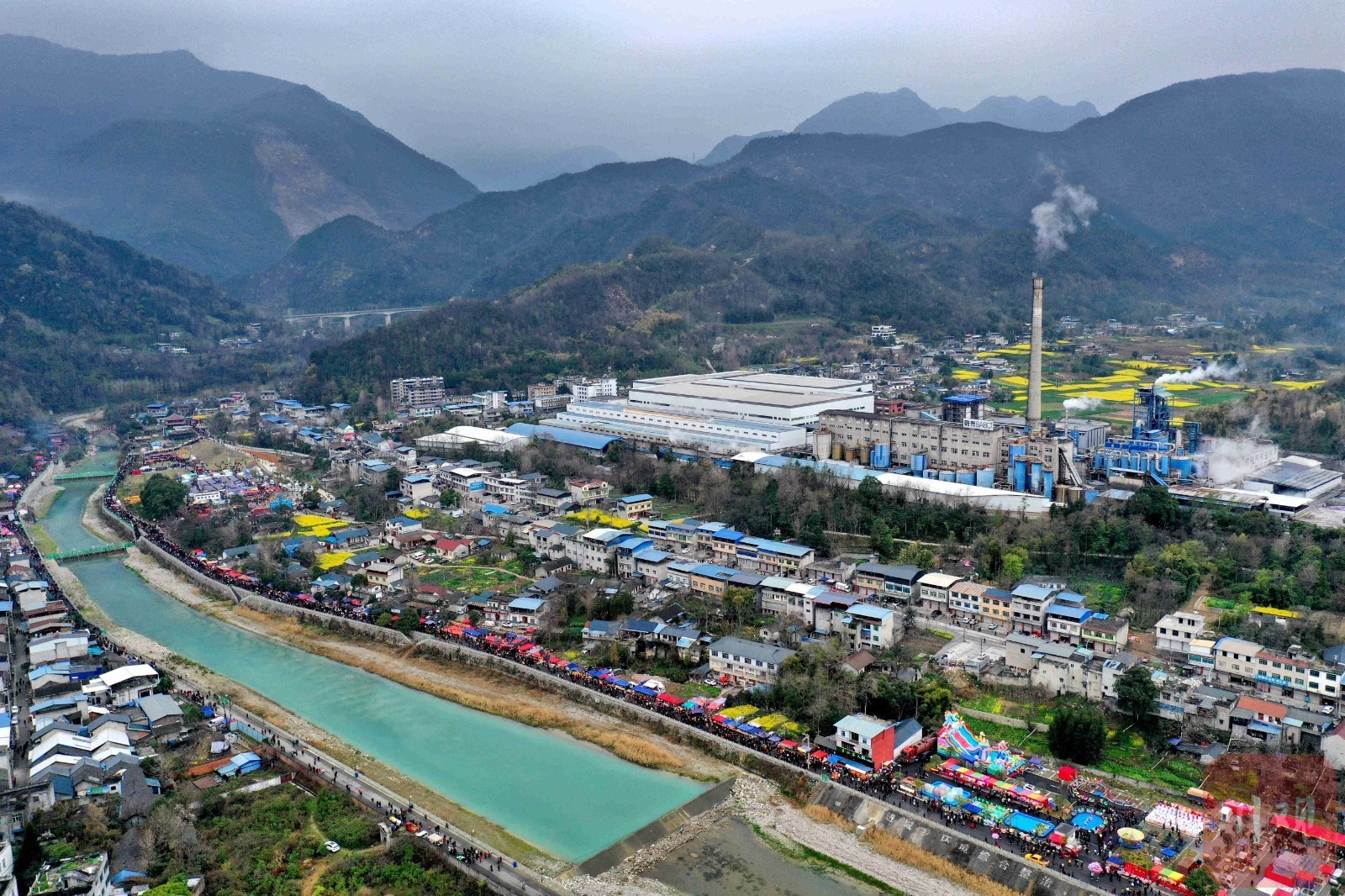 俯瞰安州区雎水镇,在踩桥会活动期间,沿河两岸摆满各类摊位。 C视觉摄影师游支健