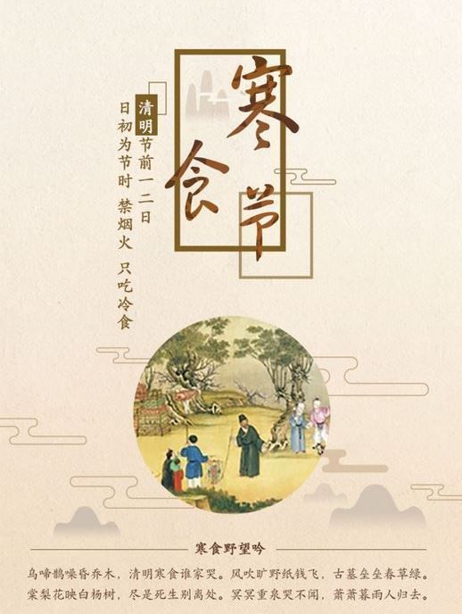 寒食,即寒食节,亦称“禁烟节”“冷节”“百五节”。在清明节前一二日,禁烟火,只吃冷食,后世发展中逐渐增加了祭扫、踏青、秋千、蹴鞠、牵勾、斗鸡等风俗,曾被称为中国民间第一大祭日。