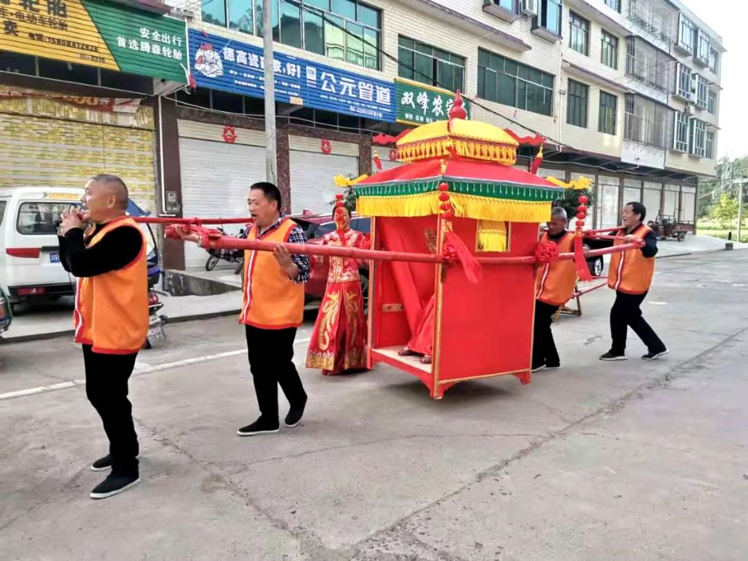 迎亲队伍出发时,一般都是杆档在前,滑竿居中,打击乐器随后,押礼先生居最后。押礼先生,一般都是当地声望特别高、知识丰富的儒雅之人。打击乐器队快到主家的某个垭口几百米远时,吩咐其他人员停下来稍作休息,来上一段喜庆的调子,一是贺喜道喜之意,增添喜庆气氛,二是给主家报喜。主家听到乐队声后,立即安排好人准备迎接。这时,男方的父母亲则要躲起来,不见新娘,新娘则由支客安排男方父母的直属姊妹带进客房稍作休息。等到吉时已到,再由伴娘搀扶出来拜天地、跪拜父母、夫妻对拜和喝交杯酒。交杯酒过后,就是给双方父母亲上茶,叩拜父母养育之恩,领红包入席。接下来,和新郎一起给在场的亲戚朋友、尊长们发喜烟喜糖、敬酒致谢。