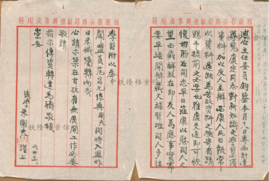 信中还关心同属西康省的甘孜地区民盟活动:“盟员范昌元,系与刚夫同时入盟,昨日来椷,嘱转向我公请示渠在甘孜有无展开工作必要。敬请指示俾资转达为祷”。范昌元,长期在西康省政界任职,曾任西康省德格县县长,甘孜专员。民国时期曾以他随身携带“范”字旗号,走访基层流动办公,现场解决问题著称。