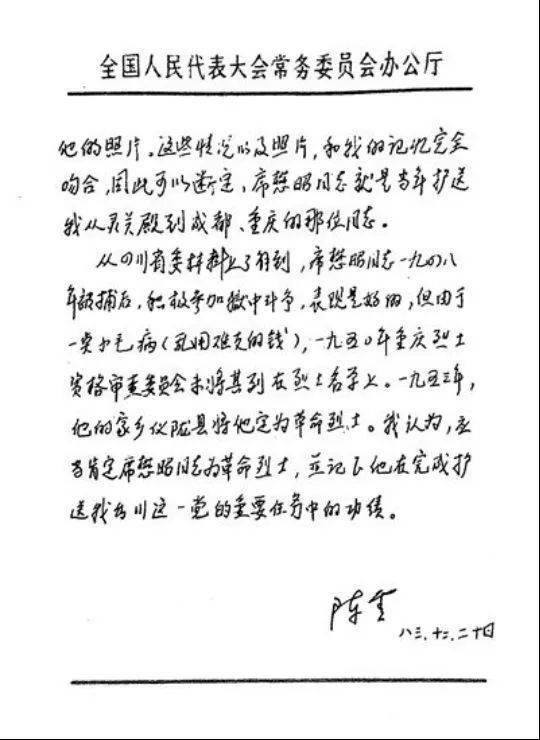 可就是这样一位为中国革命奉献了一生,直至献出生命的革命烈士,却在建国后的烈士认定工作中长期没有被肯定,直到1983年陈云亲自为其写了证明材料,建议肯定他为革命烈士,记下他在护送自己出川前往上海执行党中央特殊任务中的功绩,他才逐渐为人们所熟知。